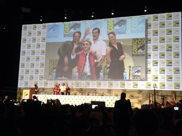 Earlier today, we reported that Warner Bros. debuted the first footage from Batman v Superman: Dawn of Justice during their massive Hall H panel at Comic-Con 2014 this morning. Just hours later, that footage has leaked online, which gives fans their first look at Ben Affleck's Batman in action, as he stares down Superman (Henry Cavill), who is seen hovering in the light emanating from Batman's Bat-signal. Take a look at the video below, which also shows the crowd reacting to director Zack Snyder introducing Ben Affleck, Henry Cavill and Gal Gadot.